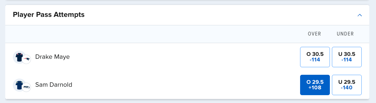 Fanduel: Sam Darnold Ov 29.5 Pass Attempts (+108, +1.4% EV)