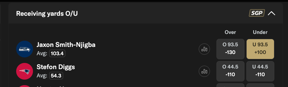 Betting the under 93.5 receiving yards for Jaxon Smith-Njigba in Super Bowl LX is a solid play because the New England Patriots boast one of the league’s stingiest pass defenses, consistently allowing low passing yardage totals that could limit a high volume target like JSN. While he dominated the regular season with elite production (averaging over 100 yards per game) and had a massive NFC Championship performance, Super Bowl matchups often feature heightened defensive schemes and pressure that cap explosive outputs from primary receivers. Trust Circa as a sharp NFL book? They recently dropped this line from 93.5 to 90.5 and put the vig -110 each way. Here you gain 3 yards against a sharp prop move and get it at +100.