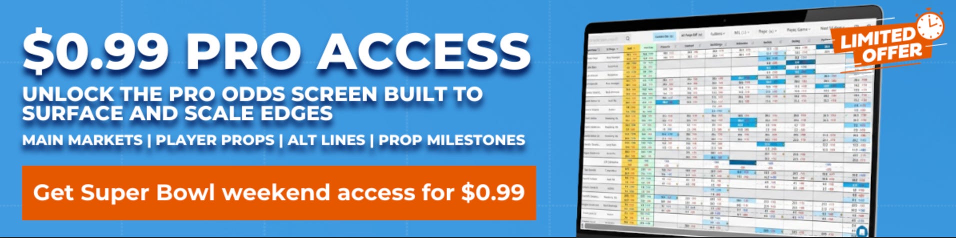 BetStamp Pro’s Super Bowl offer is actually insane. I often talk about an odds screen being the most fundamental tool for high level sports bettors, and BetStamp pro being the best screen I have ever used. The normal monthly cost is $2,500 for a full subscription, but they are giving access to the NFL tools for just 99cents. By signing up anytime between now and Super Bowl Kickoff, you can use the NFL screen for the seemingly endless NFL prop market and get a chance to test out BetStamp and if its a good fit for you. Anyone who takes advantage of the trial will get the screen Friday, Saturday and Sunday to take your Super Bowl betting to a high level.