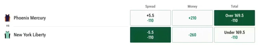 The team I’m loving right now: The Phoenix Mercury. The bet I placed; Liberty -5.5 & Liberty/Mercury Ov 169.5 (both -110 at Caesars right now).