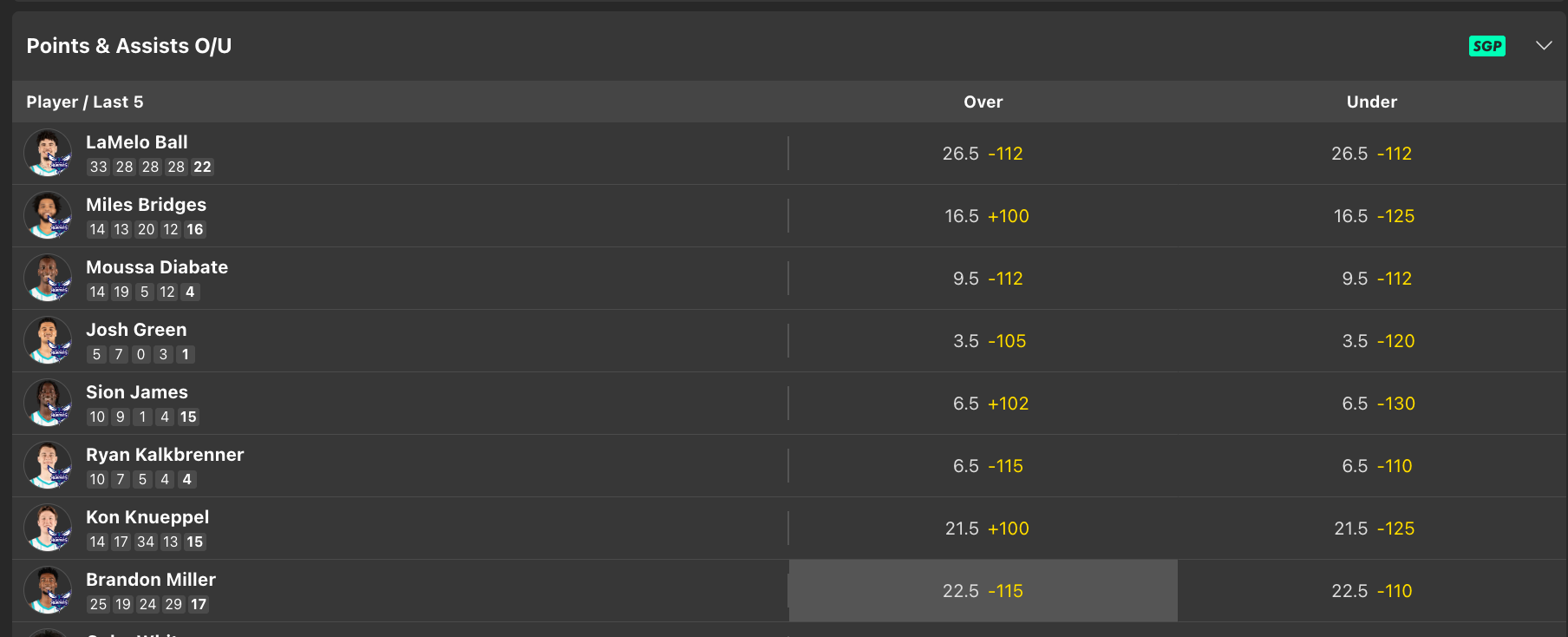 2. (CHA) Brandon Miller over 22.5 Pts + Asts (-115, Bet365 | 0.5 units)