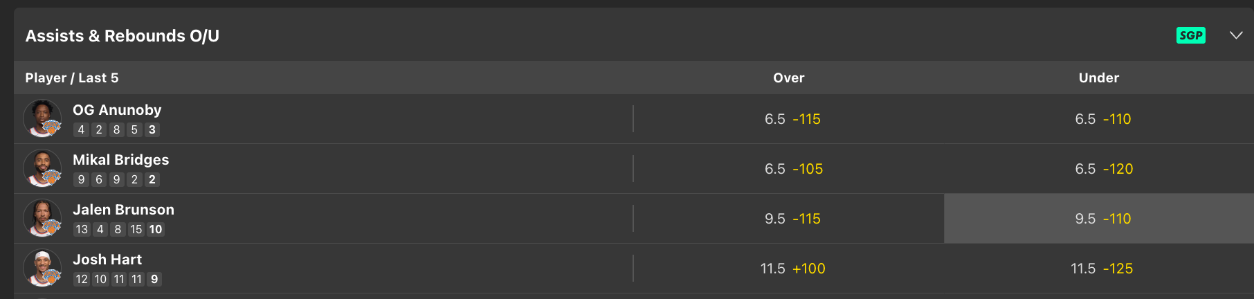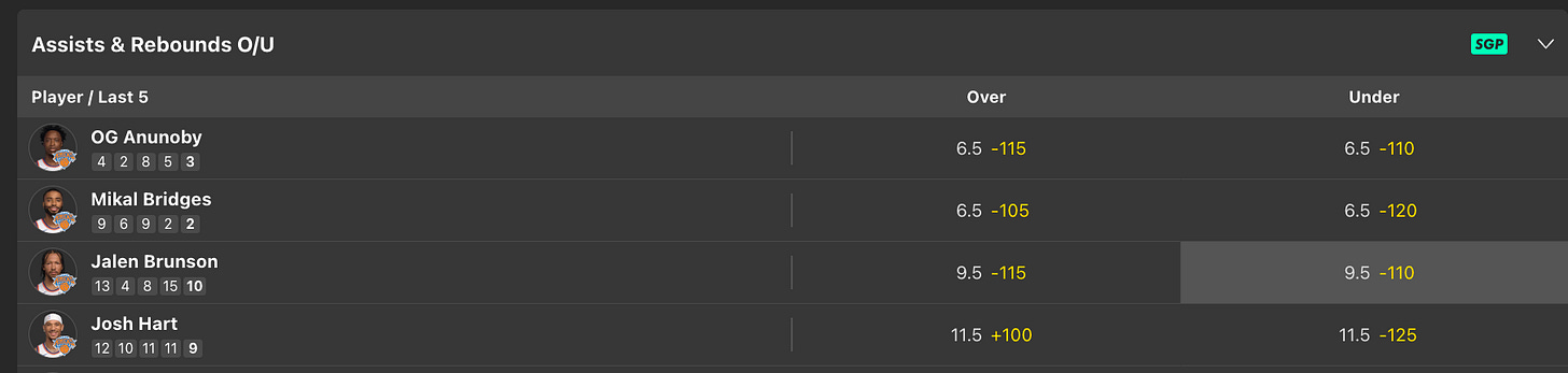 1. (NYK) Jalen Brunson under 9.5 Rebs + Assists (-110, Bet365 | 0.5 units)